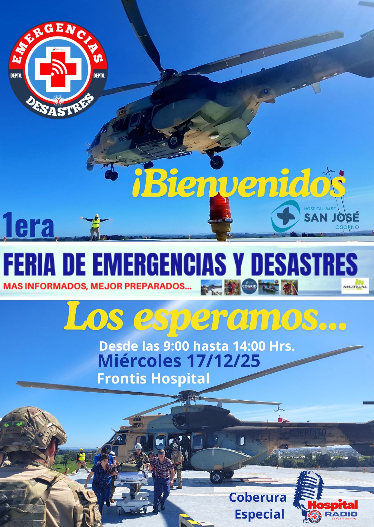 Este mércoles 17 de diciembre desde las 9:00 hasta las 14:00 Hrs., en el frontis del Hospital Base San José de Osorno, se realizará la "Primera Feria de Emergencias y Desastres 2025" organizada por el Depto. de Gestión del Riesgo de Emergencias y Desastres de este establecimiento de alta complejidad, cuya invitación se ha extendido a las distintas Organizaciones No Gubernamentales ONG de Rescate perteneciente a los voluntariados que forman parte integral del Sistema de Protección Civil en la zona.