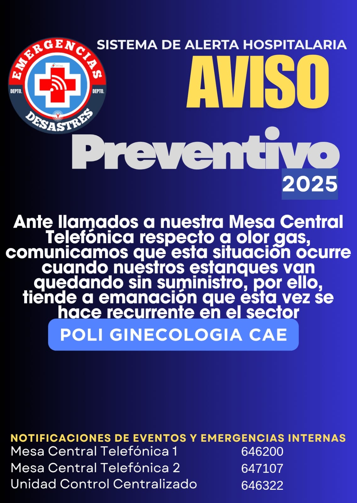 Ante llamados reiterados a mesa central del hospital, se informa a la comunidad y funcionarios (as), que el olor a gas que emanó durante esta mañana se debe a una habitualidad de nuestro sistema de suministro interno, cuando éste disminuye y se encuentra en los rángos mínimos establecidos, razón por la que tiende a propgarse entre los sectores del POLI GINE, VESTUARIO Y BIENESTAR. Sin embargo, se descarta fugas.